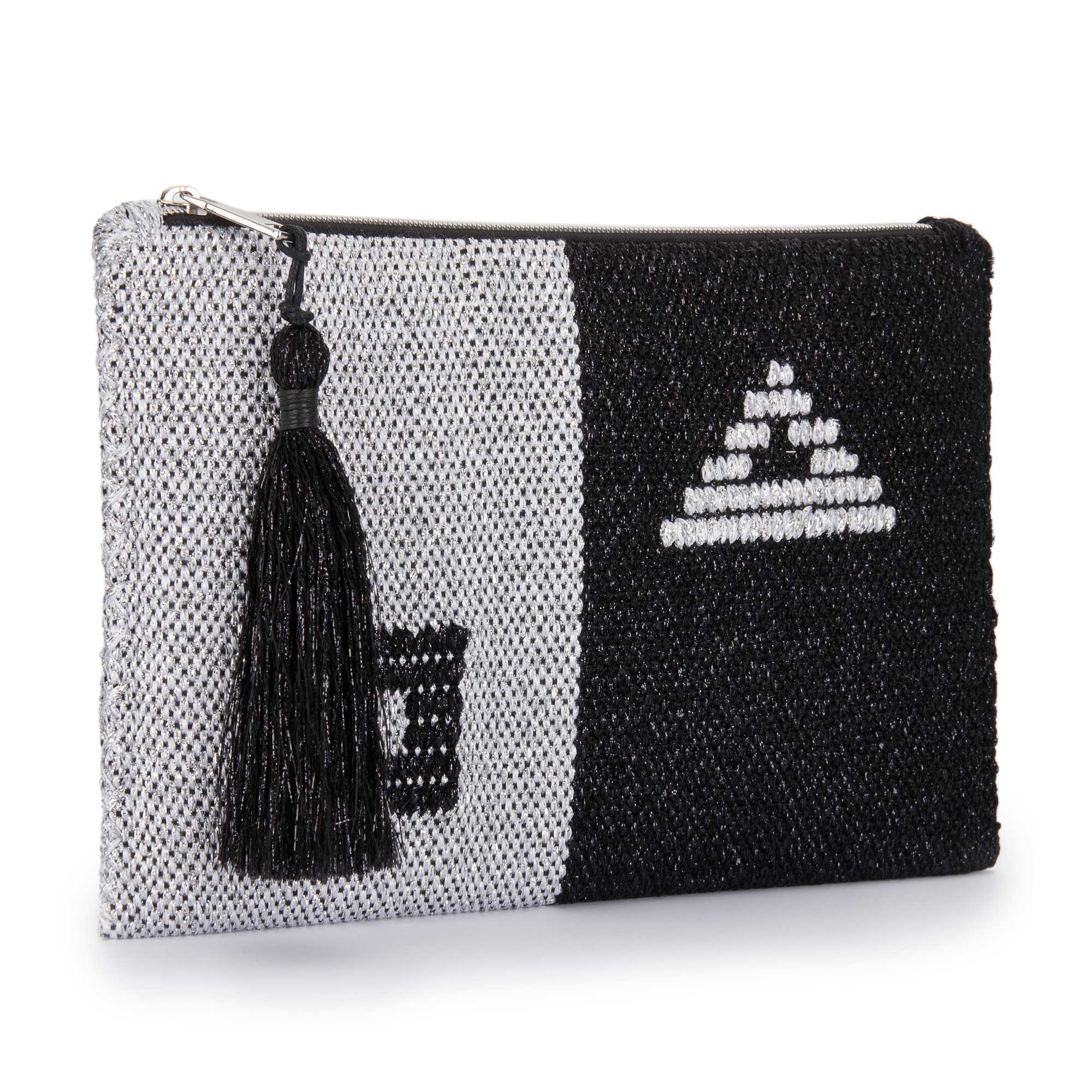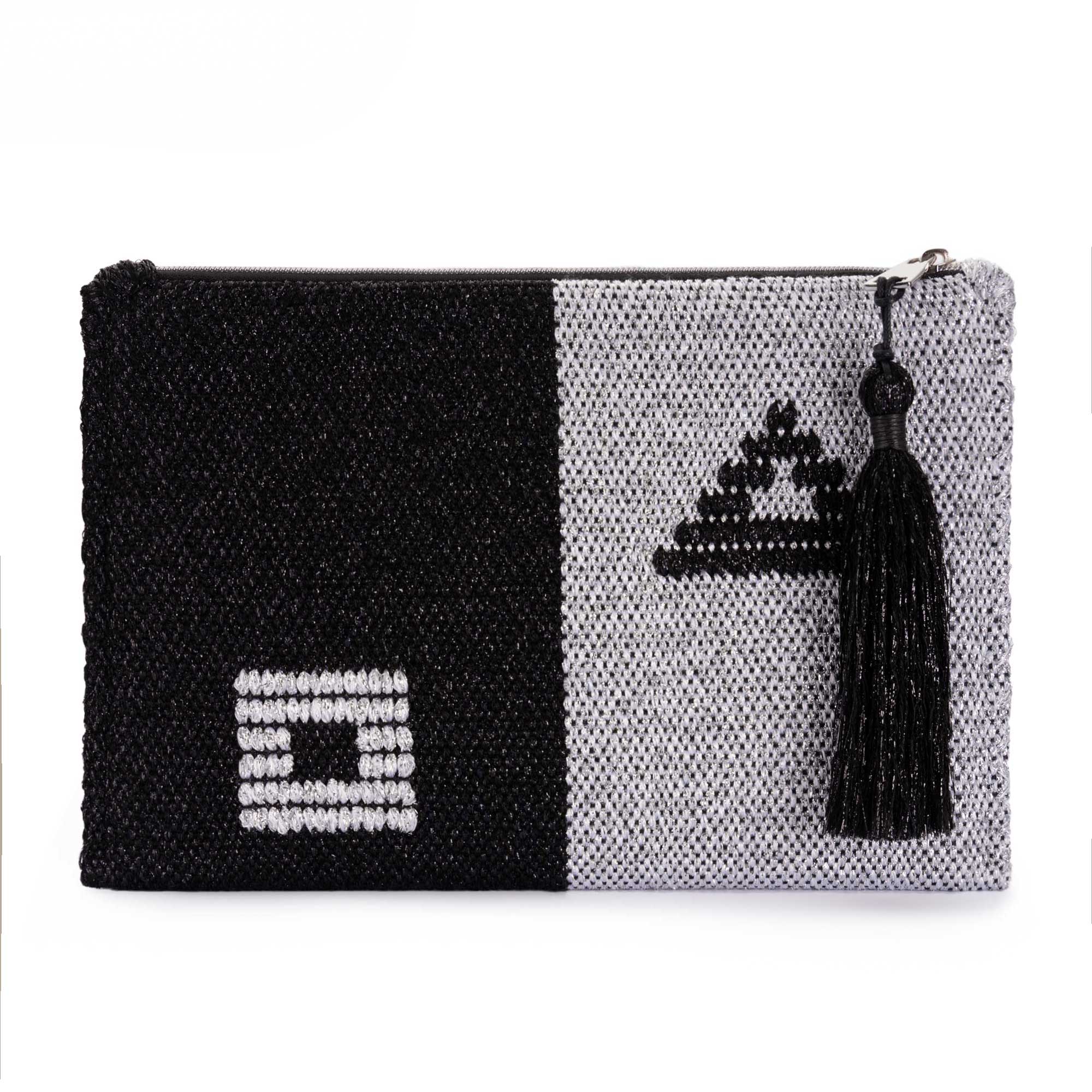 The clutch is handwoven on a manual loom and hand-sewn, with the exception of the zipper, which is machine-stitched. Metallic threads have been used in its construction. The interior features a silk lining. A handmade tassel, crafted with matching threads, hangs from the zipper.