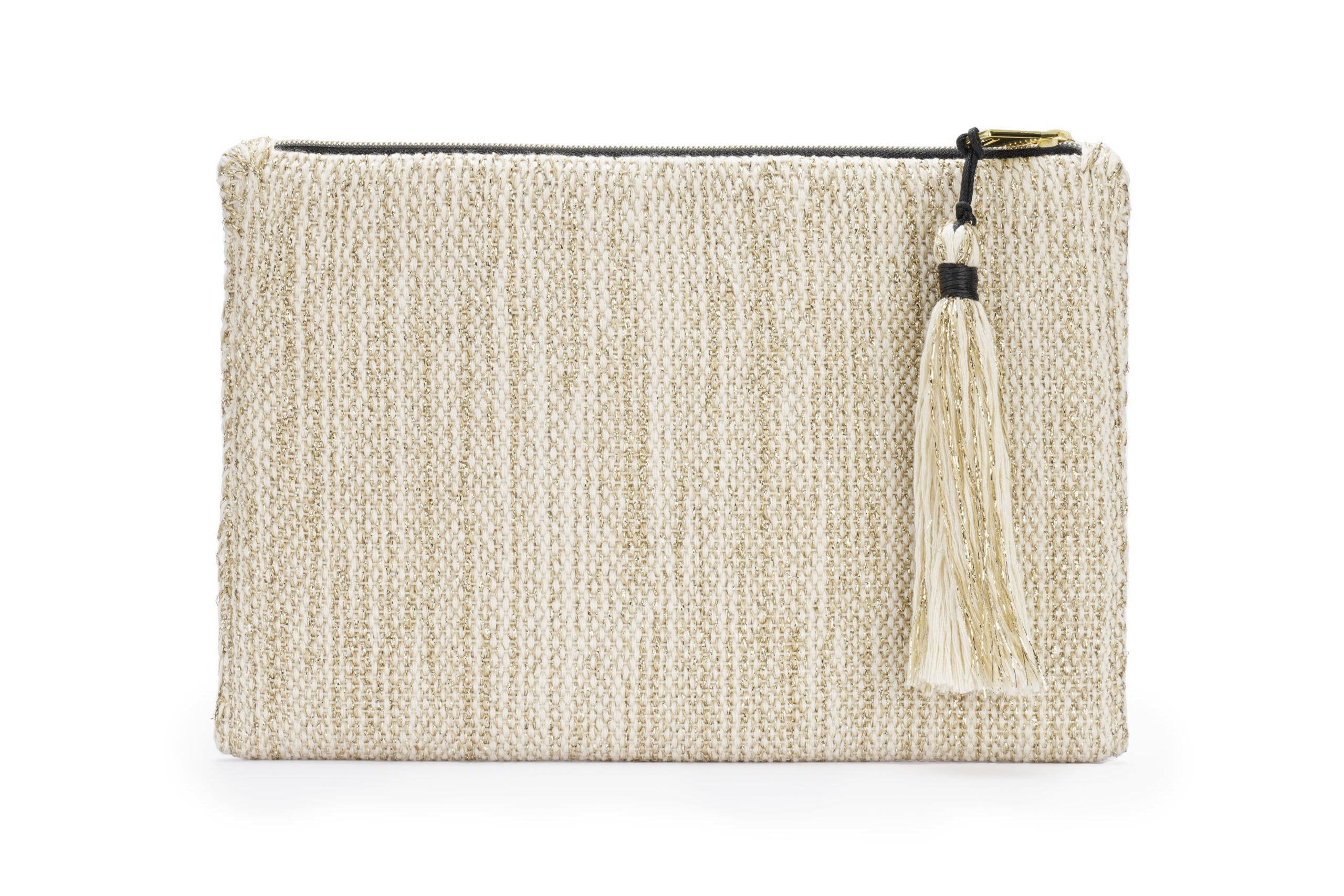 The clutch is handwoven on a manual loom and hand-sewn, with the exception of the zipper, which is machine-stitched. Metallic threads have been used in its construction. The interior features a silk lining. A handmade tassel, crafted with matching threads, hangs from the zipper.