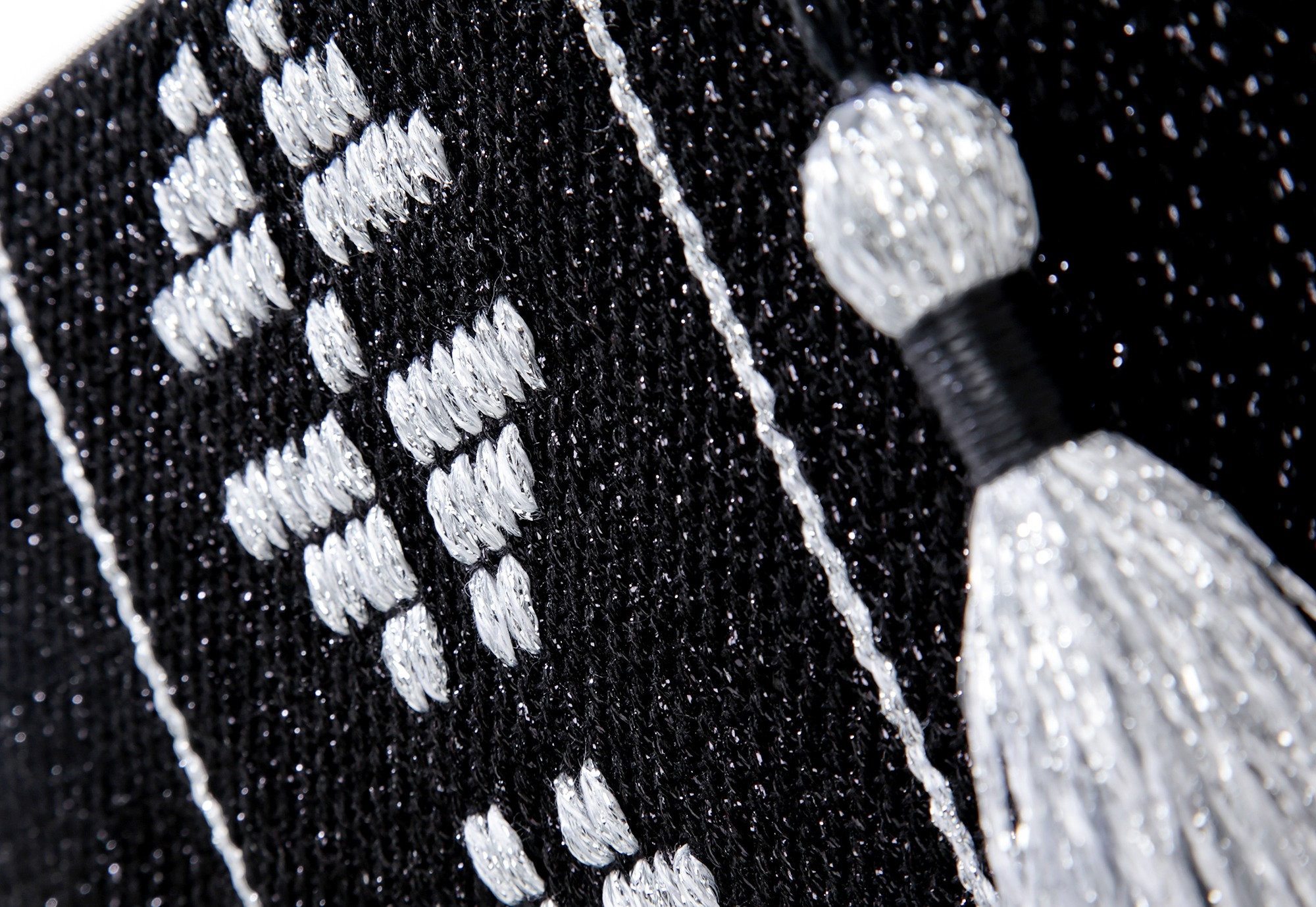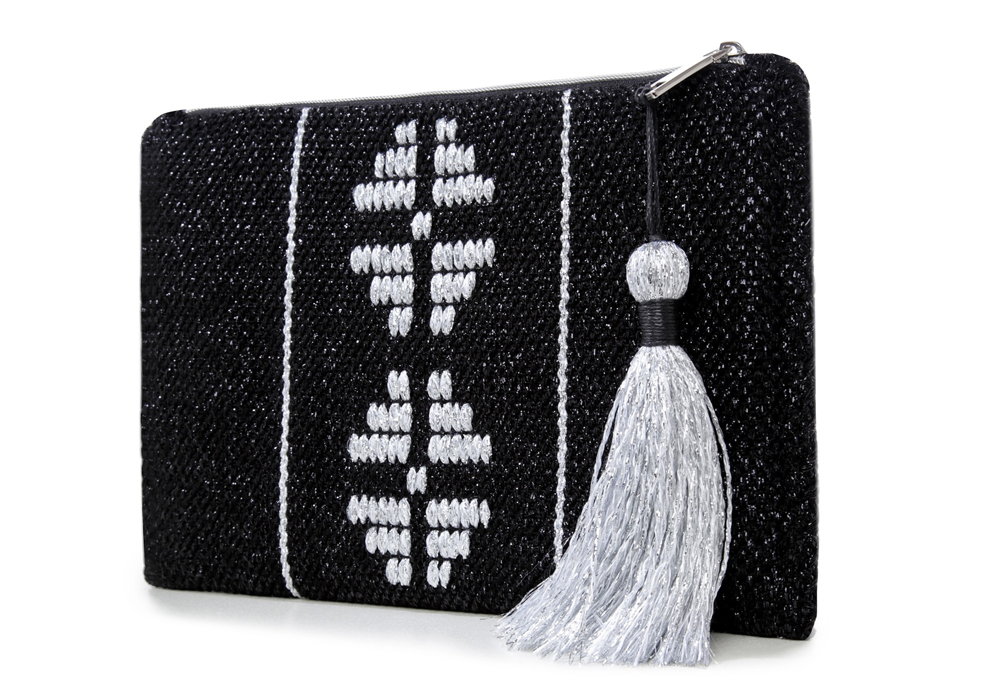 The clutch is handwoven on a manual loom and hand-sewn, with the exception of the zipper, which is machine-stitched. Metallic threads have been used in its construction. The interior features a silk lining. A handmade tassel, crafted with matching threads, hangs from the zipper.