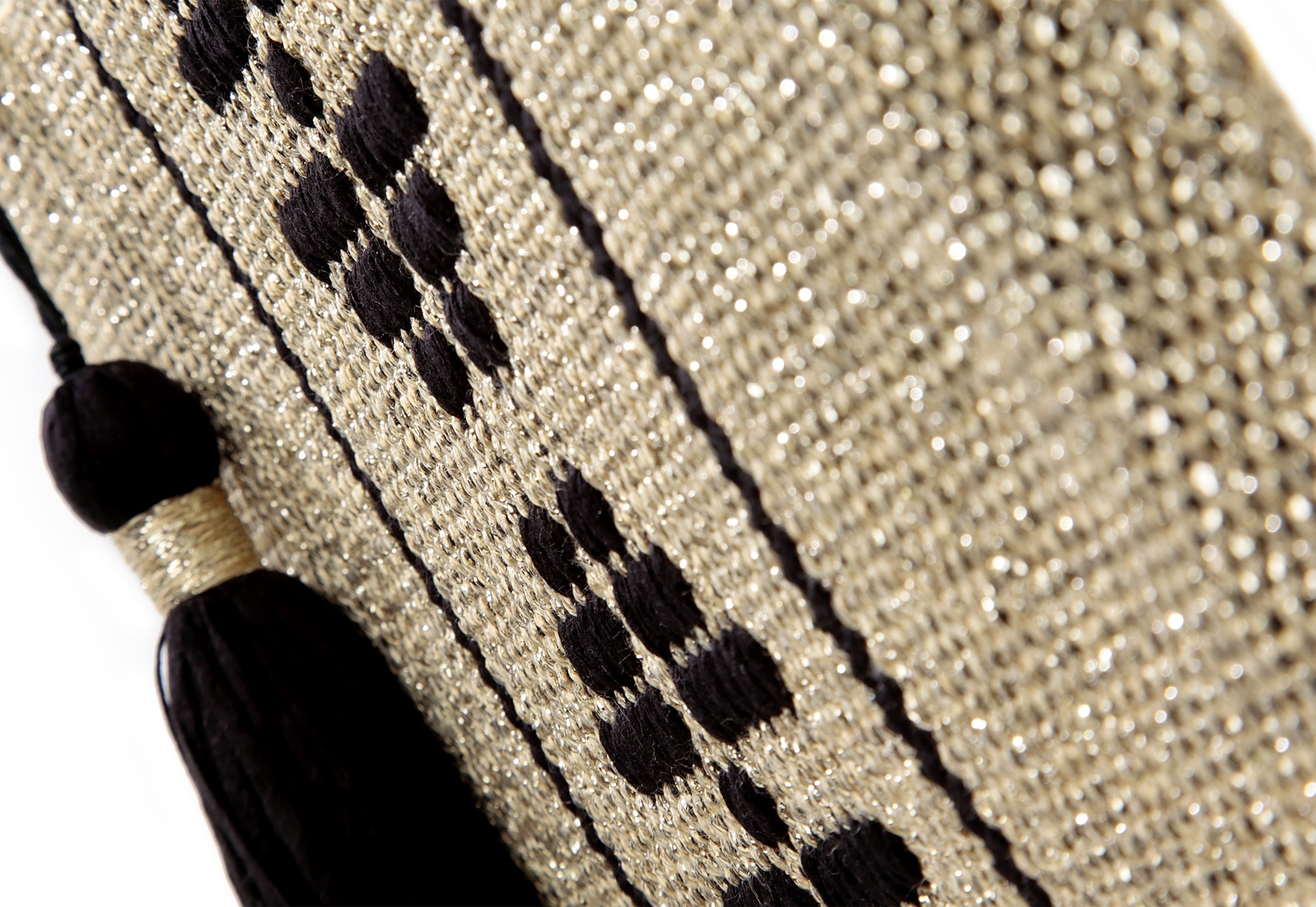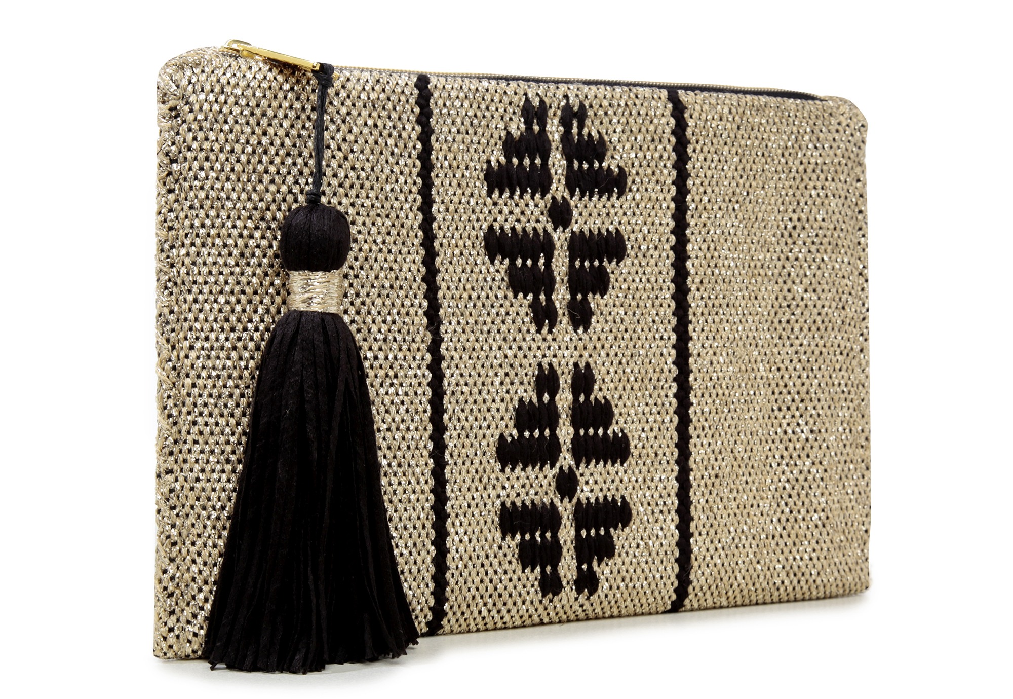 The clutch is handwoven on a manual loom and hand-sewn, with the exception of the zipper, which is machine-stitched. Metallic threads have been used in its construction. The interior features a silk lining. A handmade tassel, crafted with matching threads, hangs from the zipper.