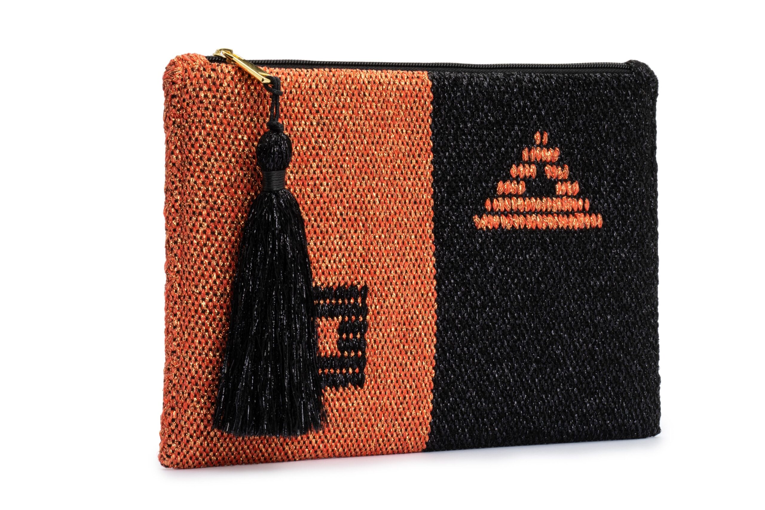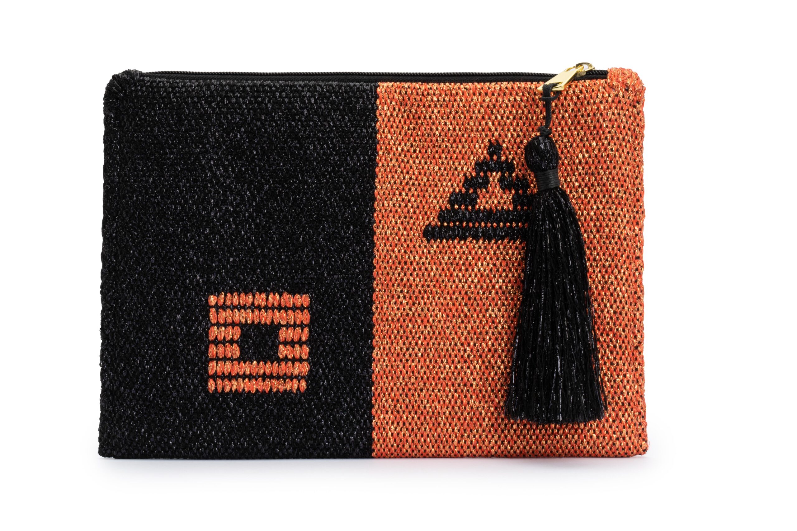 The clutch is handwoven on a manual loom and hand-sewn, with the exception of the zipper, which is machine-stitched. Metallic threads have been used in its construction. The interior features a silk lining. A handmade tassel, crafted with matching threads, hangs from the zipper.