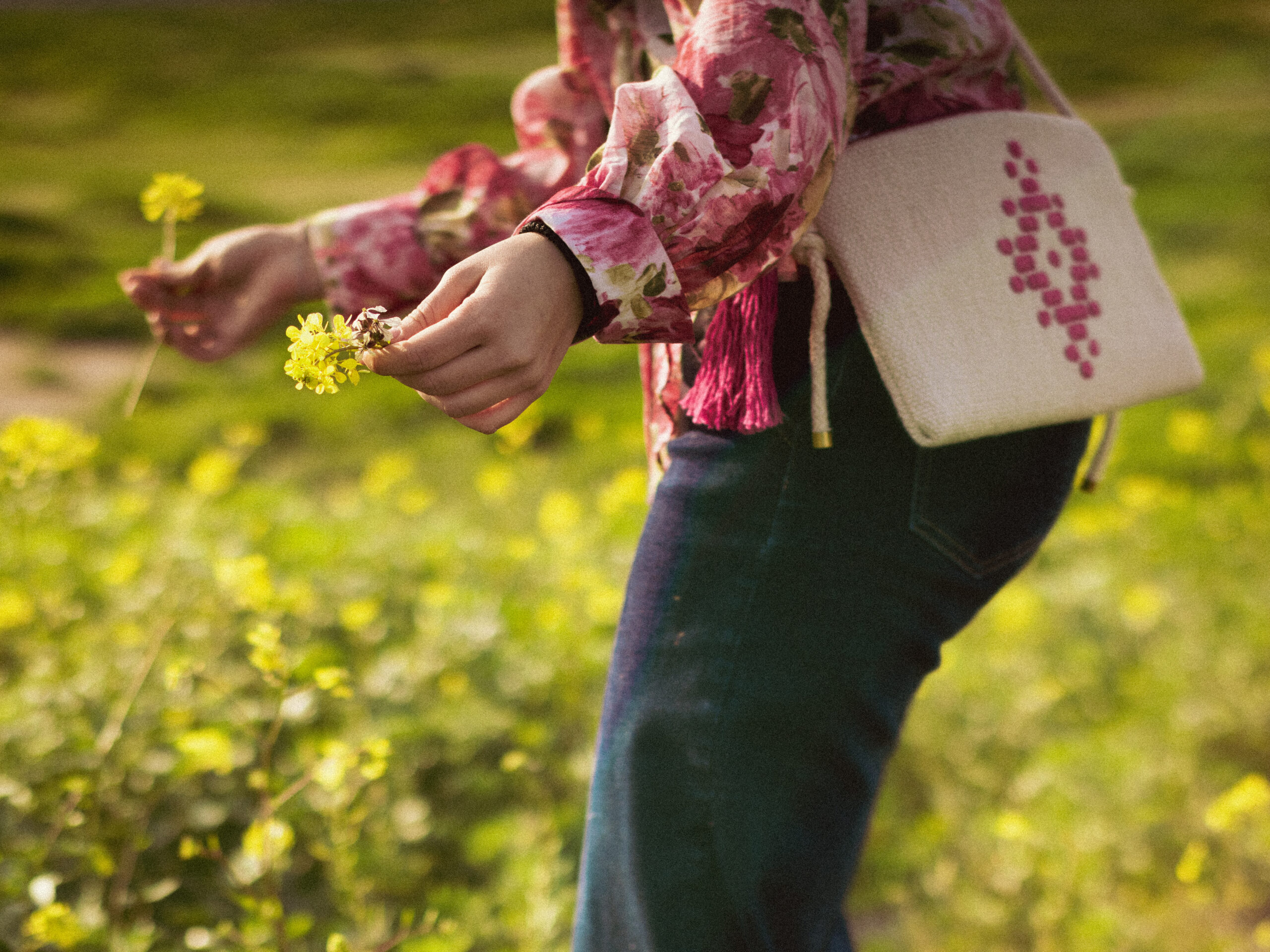Η τσάντα είναι υφασμένη σε χειροκίνητο αργαλειό και ραμμένη στη μηχανή. Έχουν χρησιμοποιηθεί βαμβακερά νήματα . Στο εσωτερικό φέρει βαμβακερή επένδυση. Στο φερμουάρ κρέμεται χειροποίητη φούντα με ανάλογα νήματα.