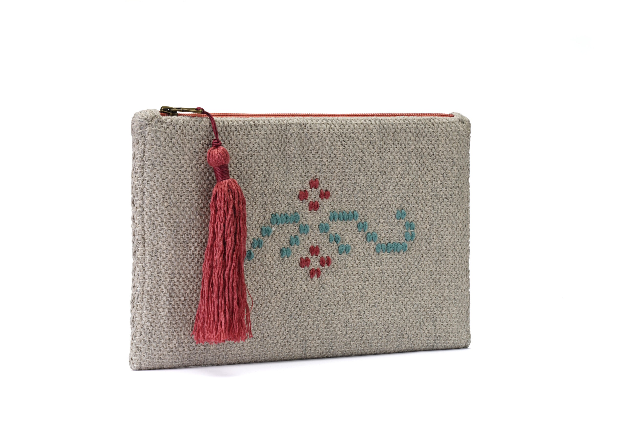 Ο φάκελος είναι υφασμένος σε χειροκίνητο αργαλειό και ραμμένος στο χέρι, εκτός από το φερμουάρ όπου ράβεται στη μηχανή. Έχουν χρησιμοποιηθεί βαμβακερά νήματα . Στο εσωτερικό φέρει βαμβακερή επένδυση. Στο φερμουάρ κρέμεται χειροποίητη φούντα με ανάλογα νήματα.